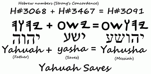 4. Yahusha as spelt in this manner depicts that the Messiah came in the name of His Father, Yahuah יְהוָֹה (H3068), adds Yasha יָשַׁע (H3467 ) which means ‘Saves’. See the diagram below:-